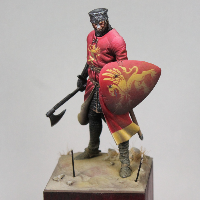 The knight was a really enjoyable project. I'd had my eye on the kit for a while. It's a pretty simple figure from Romeo Models, but there was something about it that just stood out to me. There was plenty of room for interpretation and personalization with the color scheme and iconography. The piece was also a great project to work on my metallics and my freehand. It ended up being the subject for two articles in the Illustrated Historical Artist (one on freehand and the other on TMM) and won first place in 'Eavier Metal's 'Eadbanger competition (Master Single Figure category).